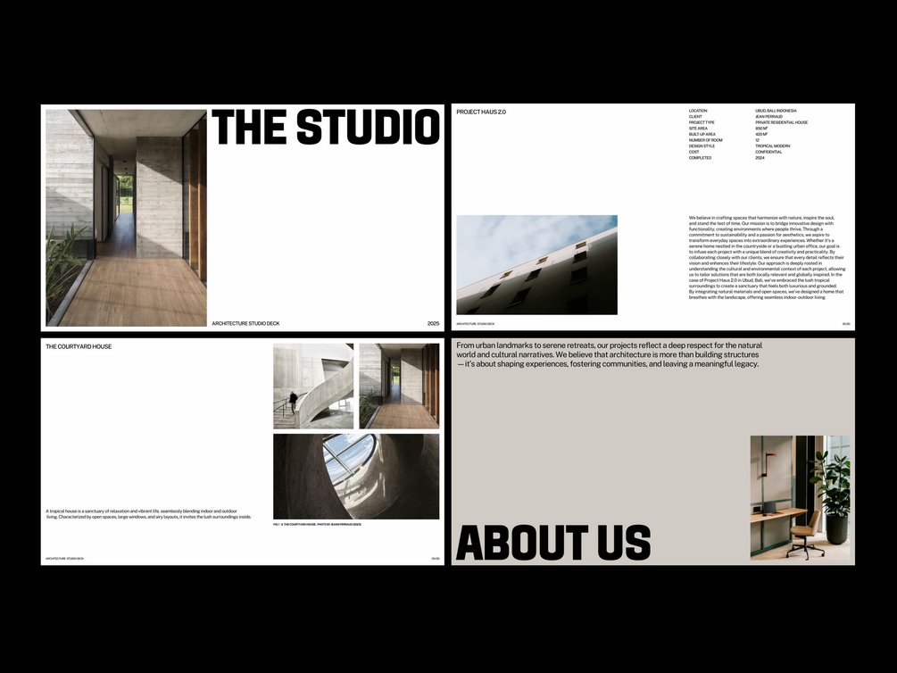 A 20–slide presentation template designed on Canva with a minimal editorial approach. Clean typography, generous white space, and structured layouts create a calm yet confident narrative. Ideal for architecture studios and design practices who want to communicate vision, process, and portfolio with clarity and elegance.